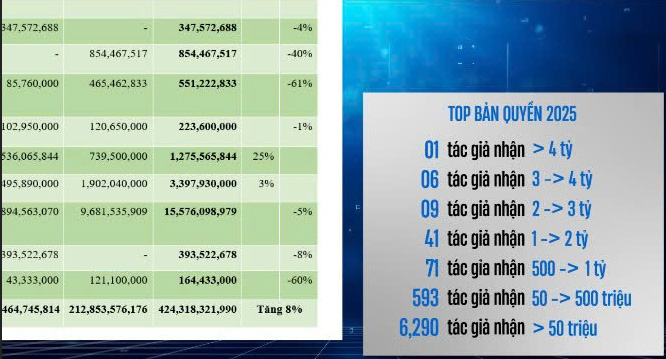 Số tiền bản quyền của kỳ phân phối Quý IV/2025 sẽ được tiếp tục đối soát để chi trả trước Tết Nguyên đán 2026; dự kiến số tiền sẽ phân phối là 120 tỷ đồng.