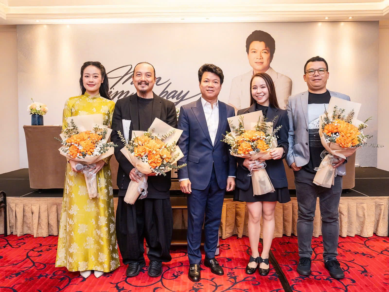 NSƯT Vũ Thắng Lợi (giữa) và ê kíp nghệ thuật của live concert "Mùa chim én bay", từ trái qua: MC Phí Linh, đạo diễn Cao Trung HIếu, ca sĩ Hồng Duyên và nhạc sĩ Hồng Kiên