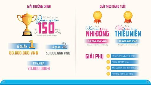 Đặc biệt, Quán quân còn nhận nhiều quyền lợi như: tham gia chuỗi chương trình nghệ thuật, cơ hội biểu diễn tại các sân khấu lớn và được đào tạo thanh nhạc chuyên sâu từ 6-12 tháng.