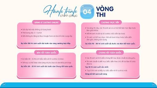 Cuộc thi gồm 4 vòng thi chính, được thiết kế khoa học nhằm tạo điều kiện cho thí sinh bộc lộ hết khả năng, rèn luyện bản lĩnh và tỏa sáng trên sân khấu.